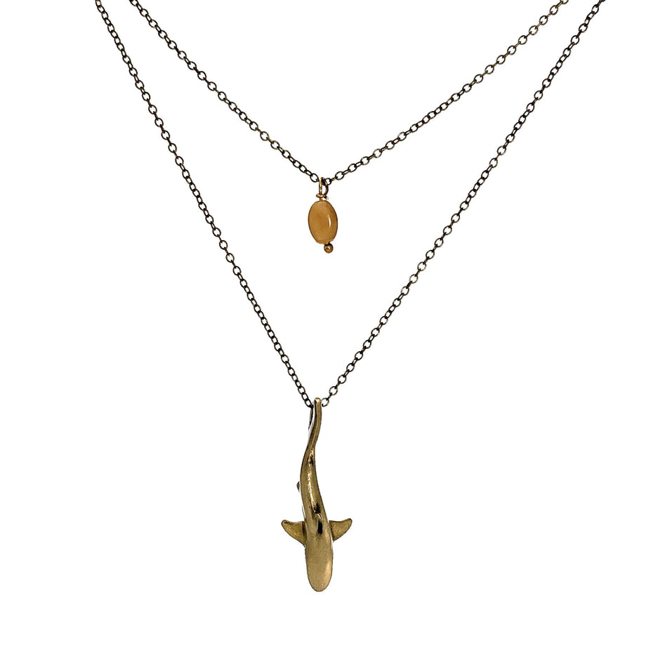 Channel boho, beachy vibes with this bronze layered shark necklace and you are certain to get a lot of attention! This gorgeous, double layered pendant features a swimming shark and a topaz colored bead on a bronze chain and looks equally great on a beach as it does on a night out.