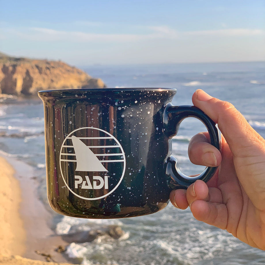 First caffeine, then shark diving… Enjoy your morning cup of coffee or tea in our large, retro shark fin ceramic mug inspired by vintage tin camping mugs.