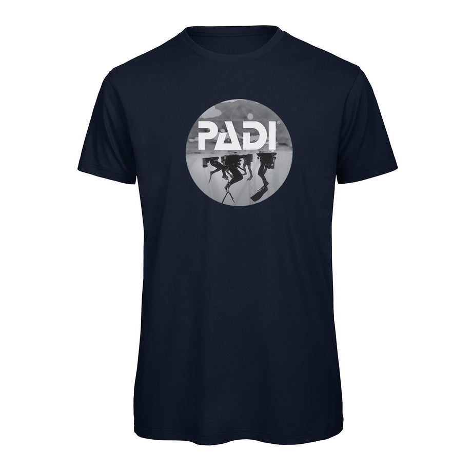 A classic tee with large PADI logo resting on an iconic photograph print of divers under water. Modern fit with crew neck.
