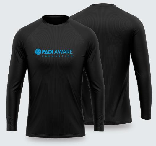 - Black rash guard with a blue PADI AWARE Foundation logo print on the chest