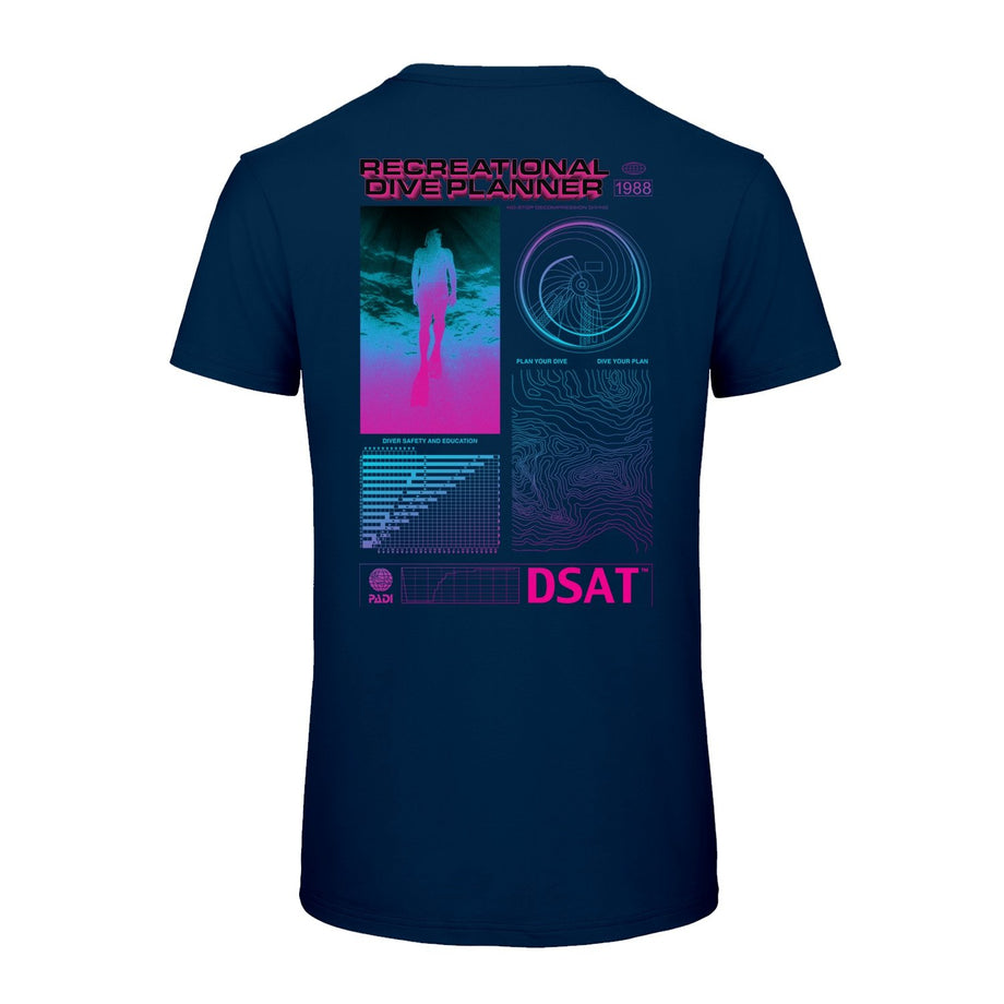 The sport of diving changed forever in the 80’s with the significant advancements in technology, training, and dive planning. PADI’s introduction of the Recreational Dive Planner based upon a completely new decompression model specifically created for recreational no-stop decompression diving marked the intersection of diving science and technology. The result? Greatly improved safety and education making diving an accessible sport for all. We’re celebrating this evolution with a “high tech”, 80’s inspired design in “totally tubular” neon colors on an organic t-shirt symbolizing the next era in our sport.