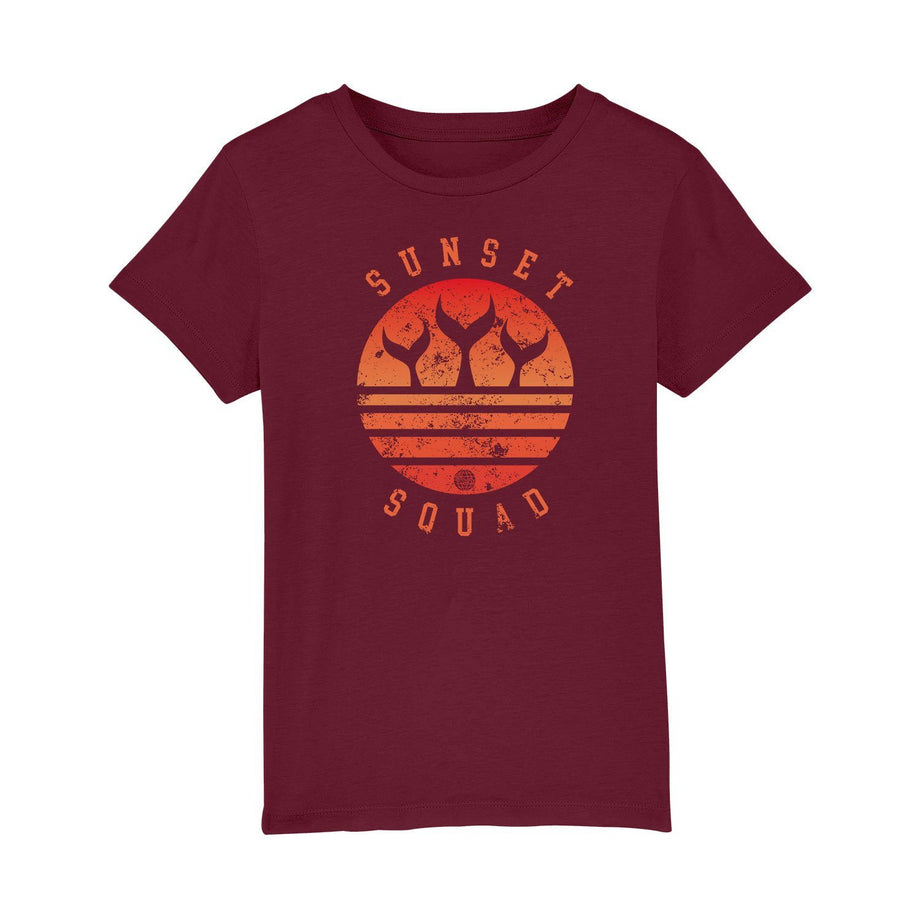 - Sunset inspired mermaid design on rich burgundy mid-weight 100% cotton tee